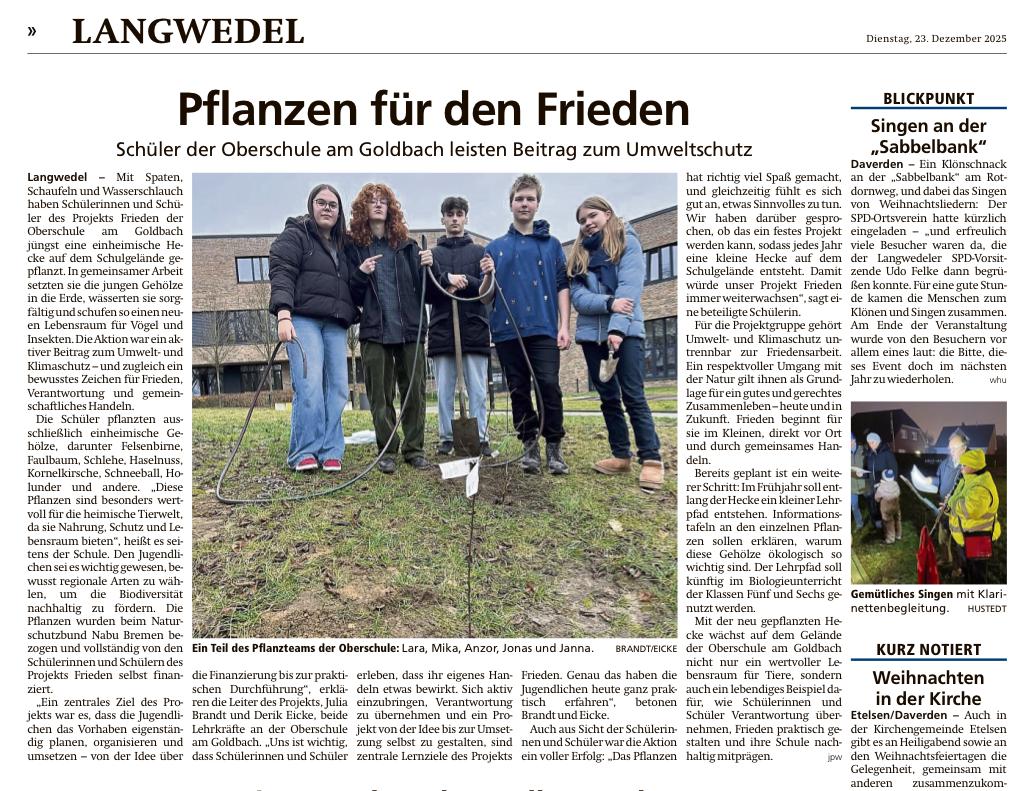 Auch Nachhaltigkeit und Umweltbildung sind feste Bestandteile des Projekts. Mit der „Friedenshecke“ haben die Schüler:innen einen Lern- und Lebensraum für Pflanzen, Insekten und Vögel geschaffen. Das Projekt verbindet Friedensbildung, Naturschutz und Unterricht und ist zugleich für die Öffentlichkeit zugänglich. Das Projekt wird jährlich weitergeführt.